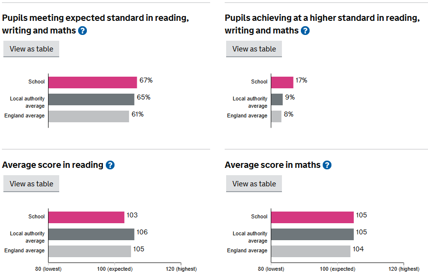 Results show in Year 6, 67% of children achieved the expected standard + in reading, writing, maths combined (higher than national at 61%). 17% of children achieved the higher standard in reading, writing and maths combined (higher than national at 8%).